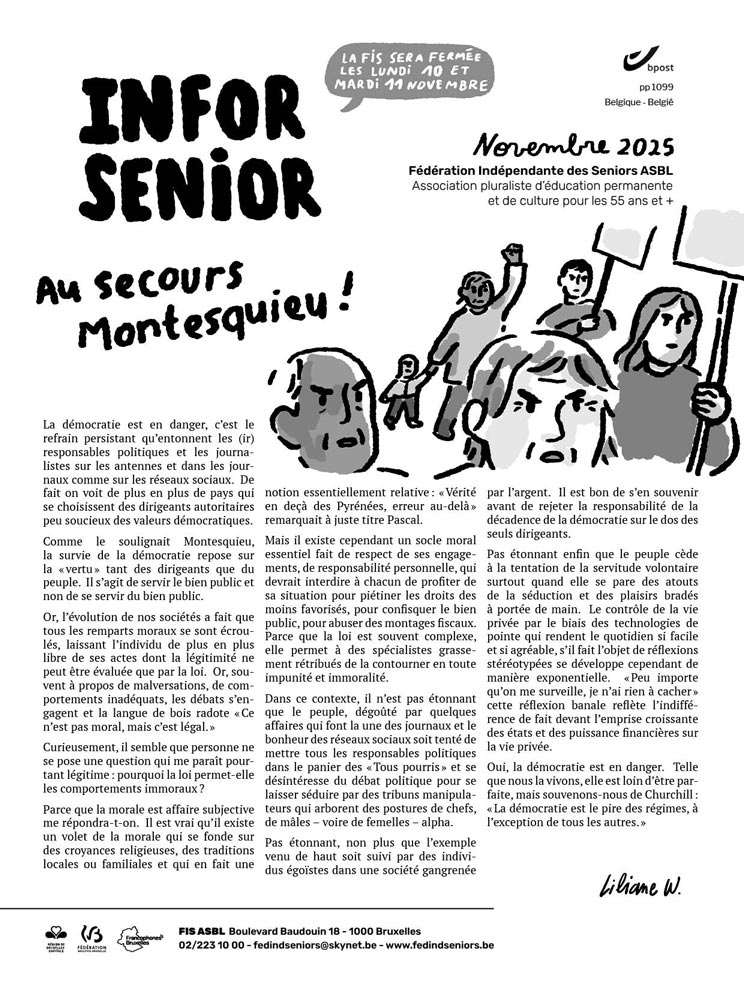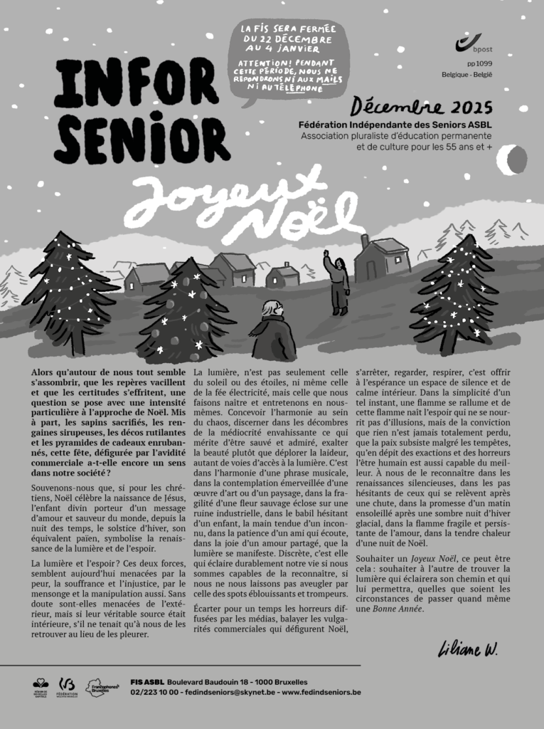 Nous avons la chance d’avoir notre éditorialiste Liliane Windels, pour nous réaliser de superbes éditoriaux chaque mois. Vous pouvez les lire ici et dans notre Infor Senior.