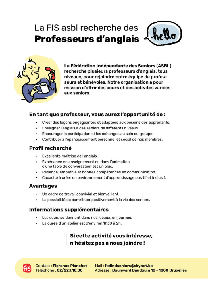 La Fédération Indépendante des Seniors (ASBL) recherche plusieurs professeurs d’anglais, tous niveaux, pour rejoindre notre équipe de professeurs et bénévoles. Notre organisation a pour mission d’offrir des cours et des activités variées aux seniors.